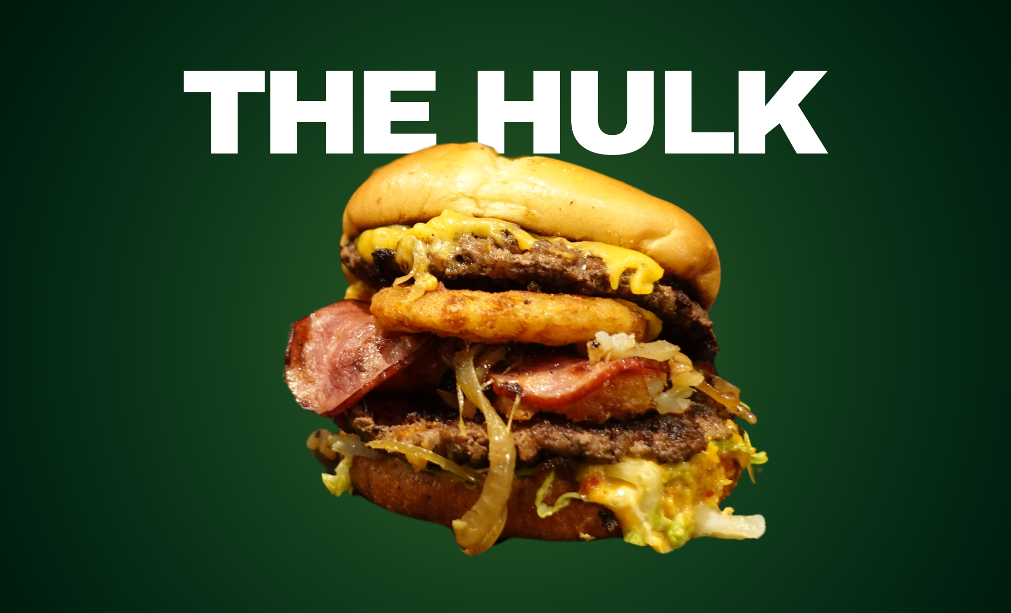Two smash patties, crispy turkey rashers, onion rings, and a hash brown—stacked to monstrous proportions. Step up and conquer The Hulk at Get Smashed!